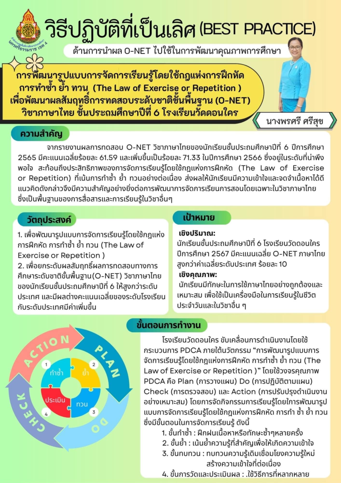 "การพัฒนารูปแบบการจัดการเรียนรู้โดยใช้กฎแห่งการฝึกหัด การทำซ้ำ ย้ำ ทวน (The Law of Exercise or Repetition) เพื่อพัฒนาผลสัมฤทธิ์การทดสอบระดับชาติขั้นพื้นฐาน (O-NET) วิชาภาษาไทย ชั้นประถมศึกษาปีที่ 6 โรงเรียนวัดดอนใคร"